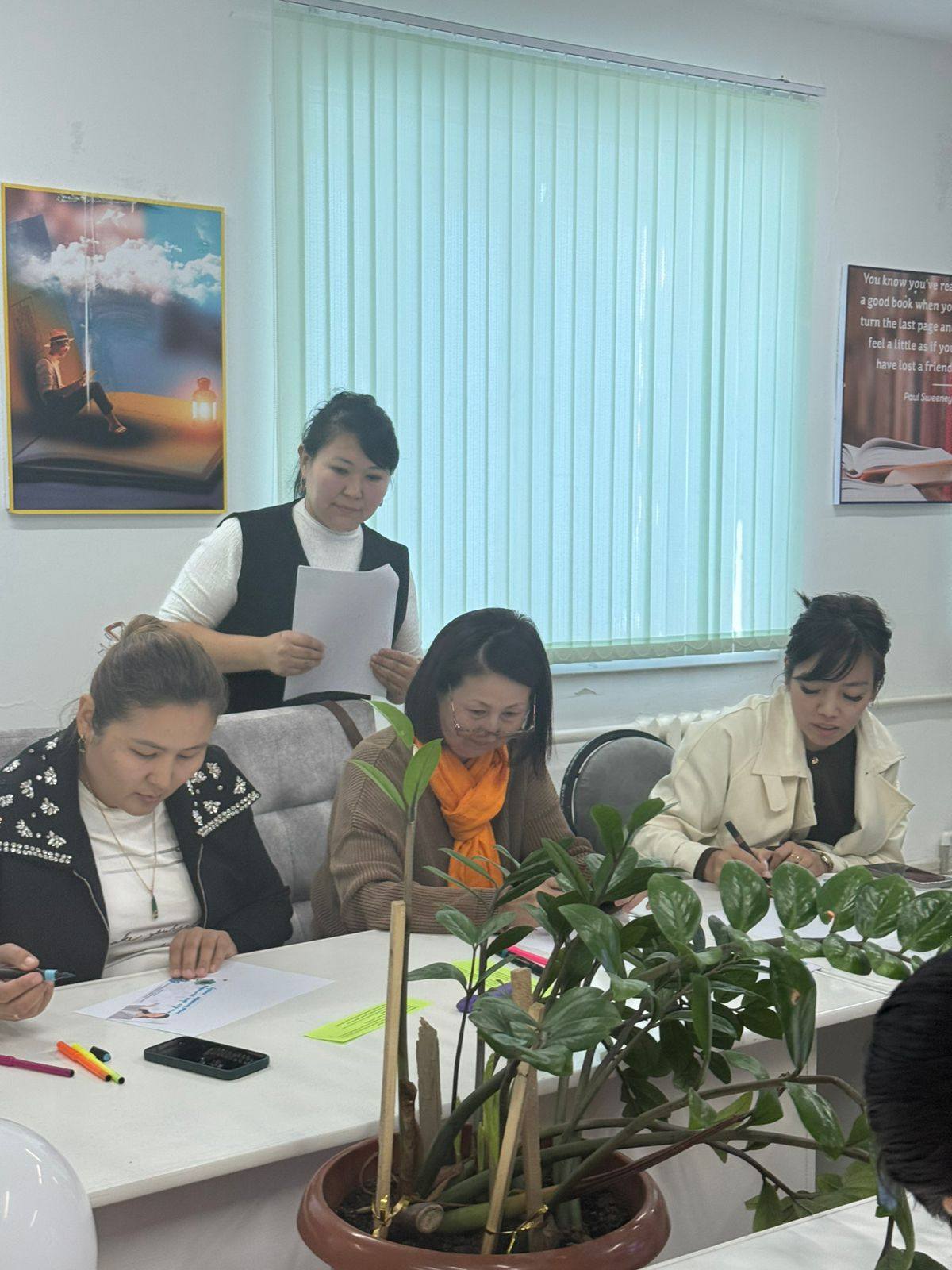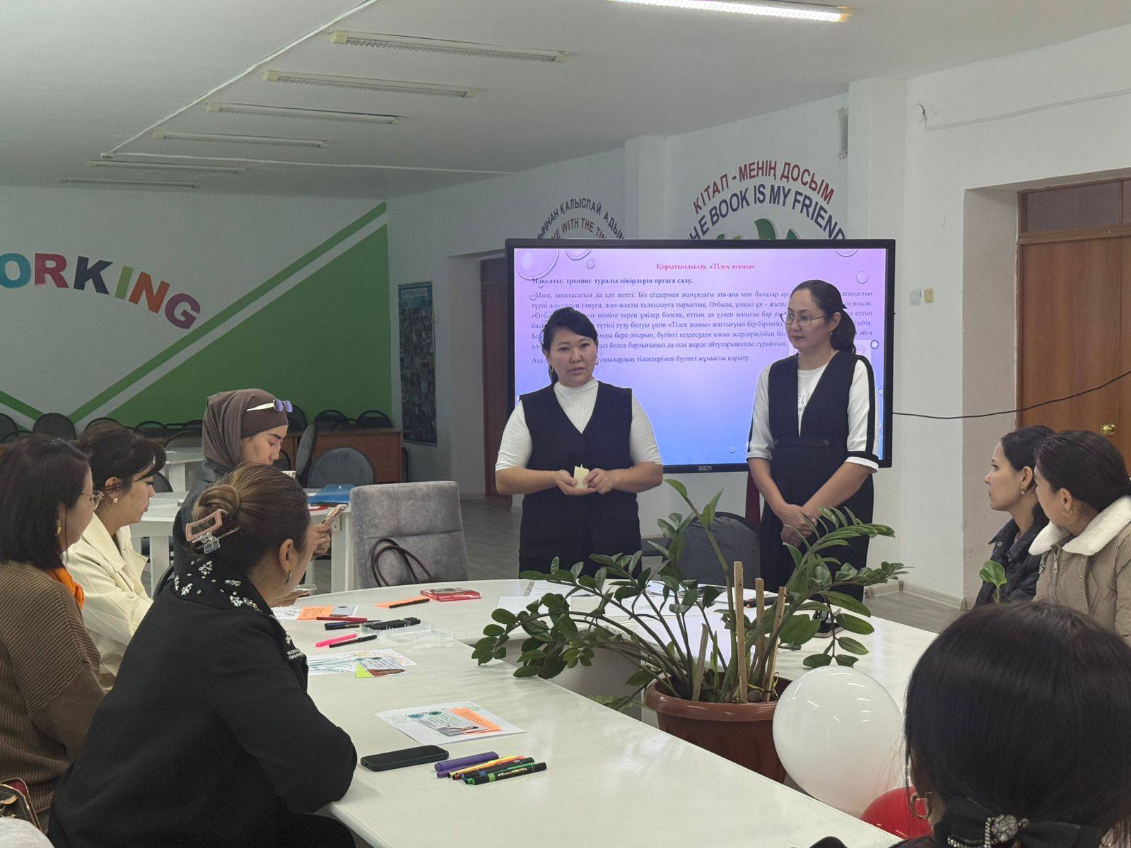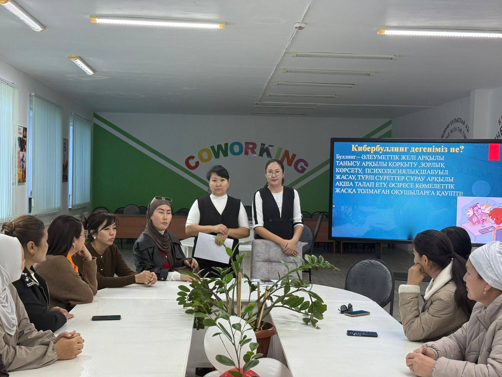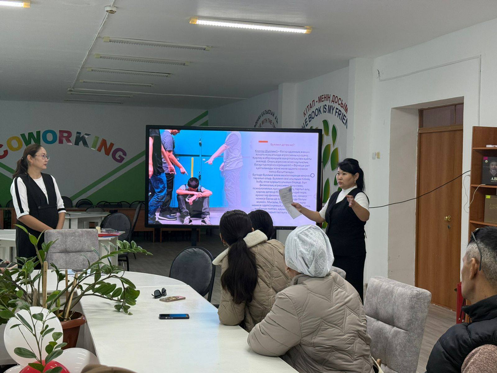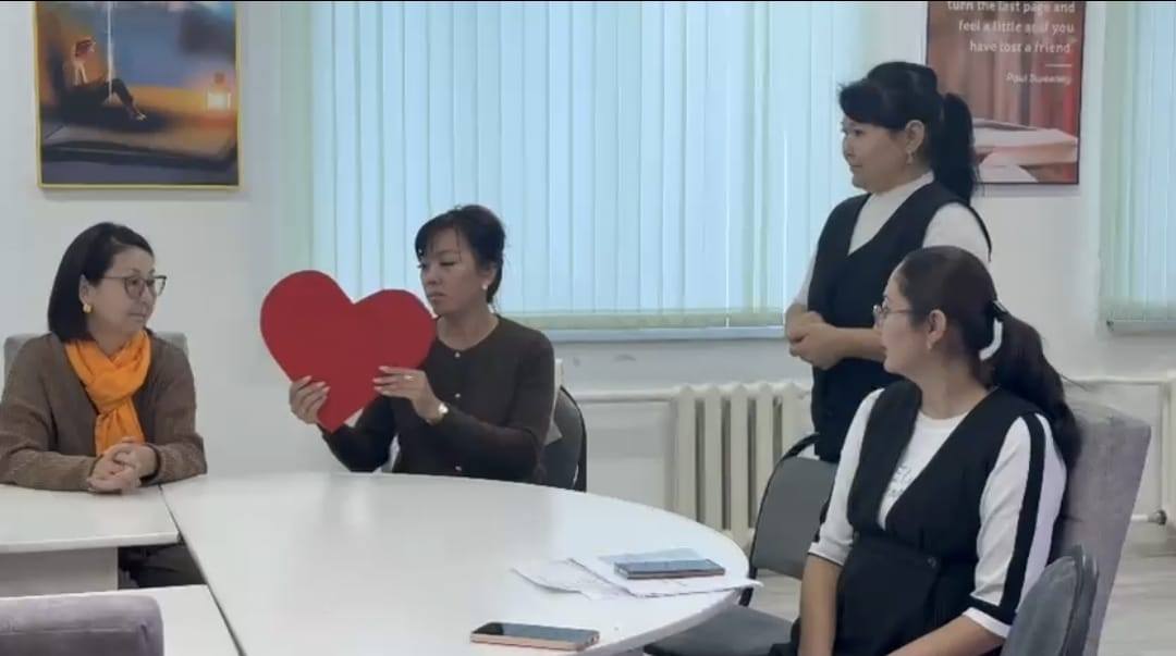 Ата-аналармен «Менің атым-менің күнім» тренингімен танысу жүргізілді. Тренинг барысында ата-аналар жүрекшені бір-біріне беру арқылы өз есімін айтып, бүгінгі көңіл-күйін бір сөзбен сипаттады. Ата-аналар жақсы көңіл-күйде, жақын қарым-қатынаста болды. Әрі қарай ата-аналарға буллинг дегеніміз не?, ол қай жерде болуы мүмкін?, балаңыз сізге осындай жағдай туралы айтады ма? сұрақтары қойылды. Жауаптар арқылы ата-аналардың бастапқы түсінігі бағаланды. А.Ж.Жаксыбаева буллинг, кибербуллинг жөнінде ақпарат берді. Тренинг соңында 5-6 сынып ата-аналарымен «Балалар буллинг, кибербуллингтің құрбаны болғанда не істеу керек?» тақырыбында бірнеше жағдаяттар талқыланды. Тренинг соңында ата-аналар іс-шарадан алған әсерлерін жазып, суретке эмоцияларын бейнеледі.