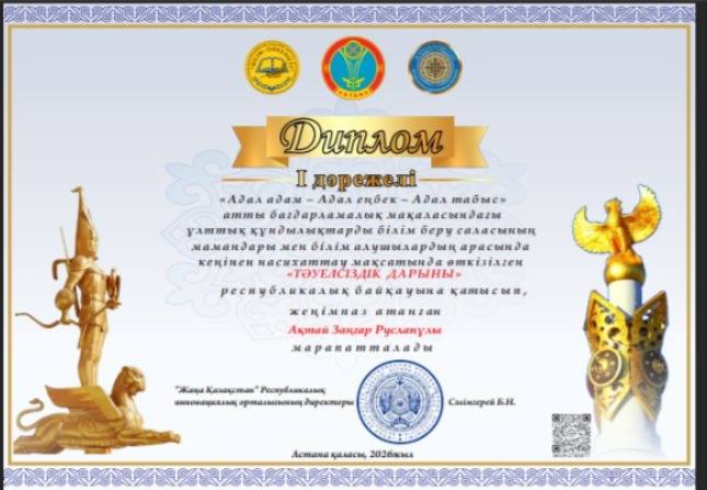 Аталған байқауға мектеп-лицейіміздің 4 «С» сынып оқушысы Ақтай Заңғар қатысып, жүлделі І дәрежелі дипломмен марапатталды.