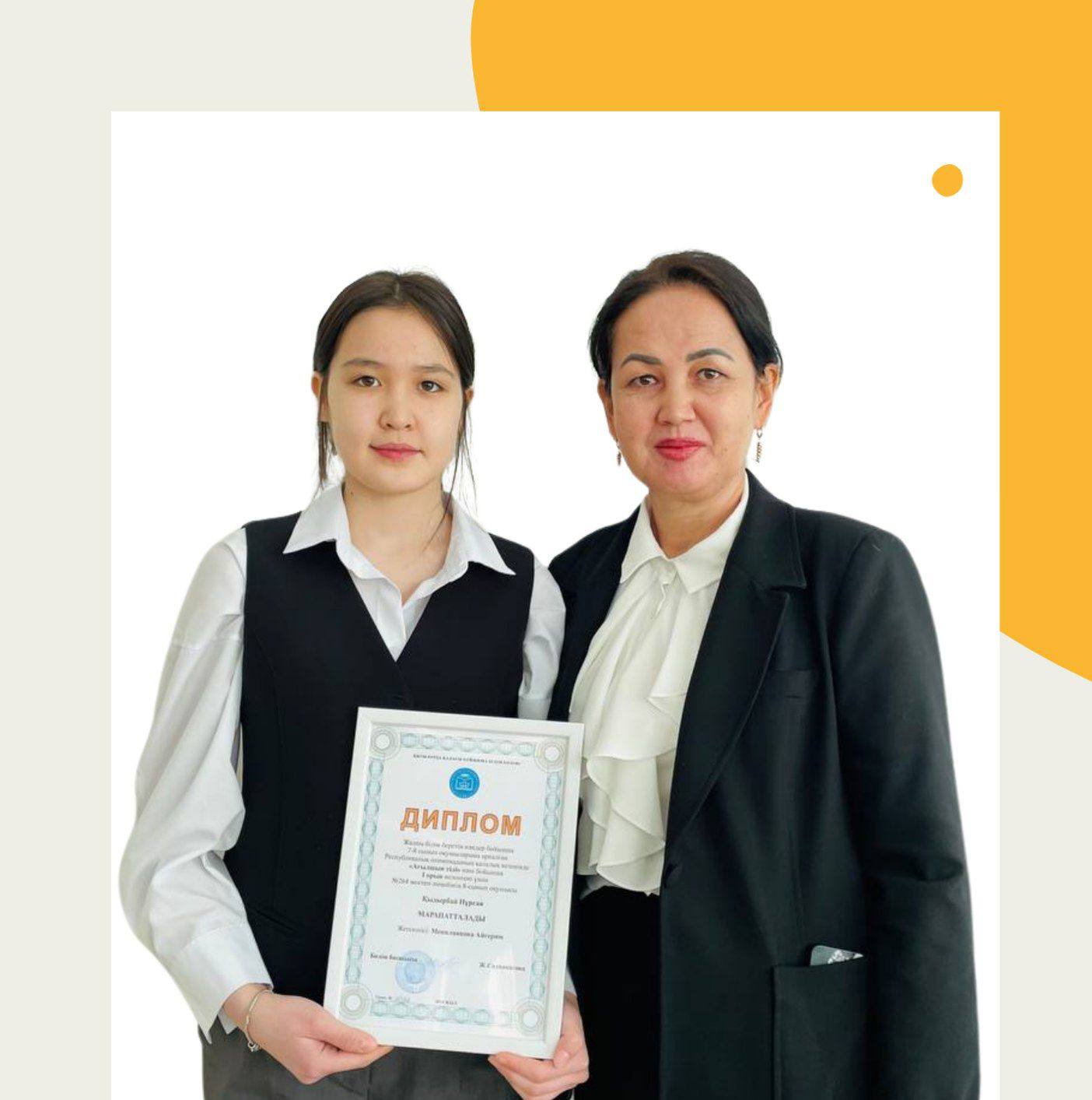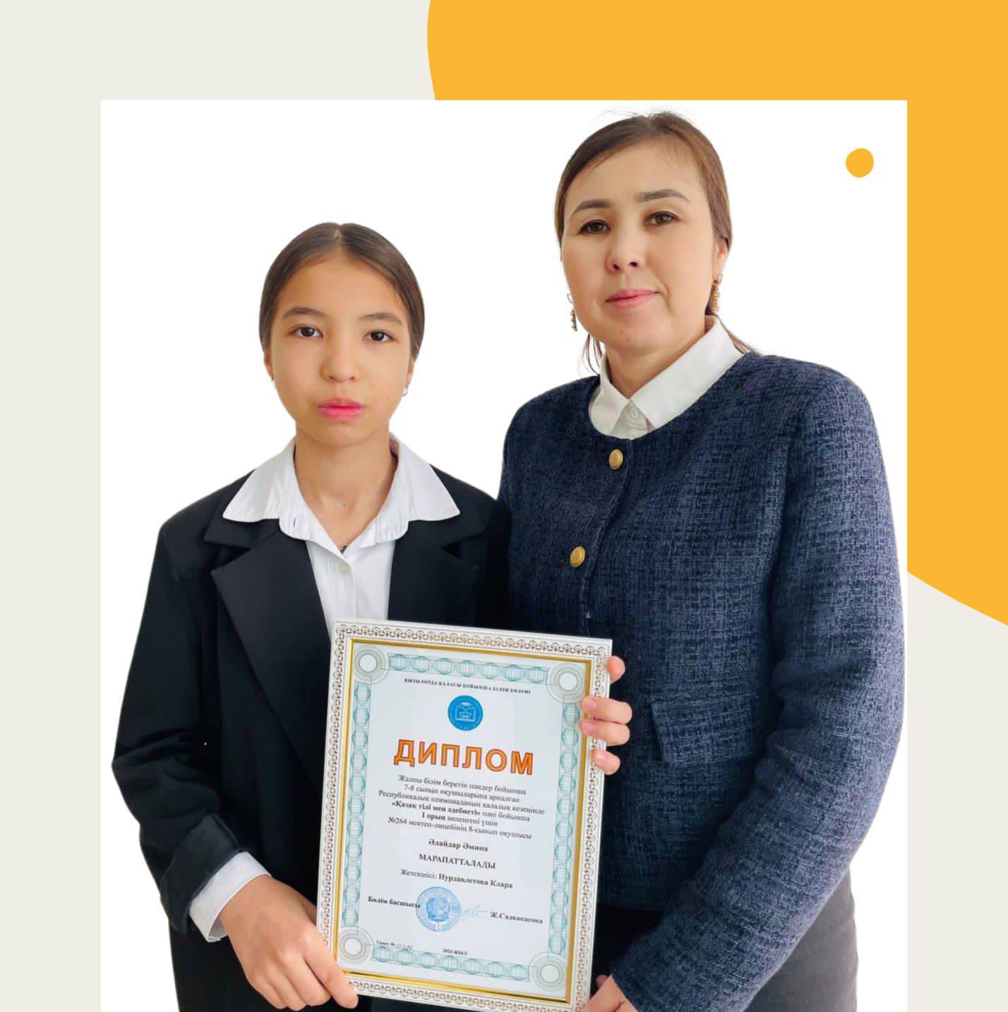 8 - сынып оқушысы Қыдырбай Нұрсая 2 - орын, жетекшісі - Менилаякова Айгерім; Алайдар Амина 3 - орын иеленді, жетекшісі - Нурдавлатова Клара.